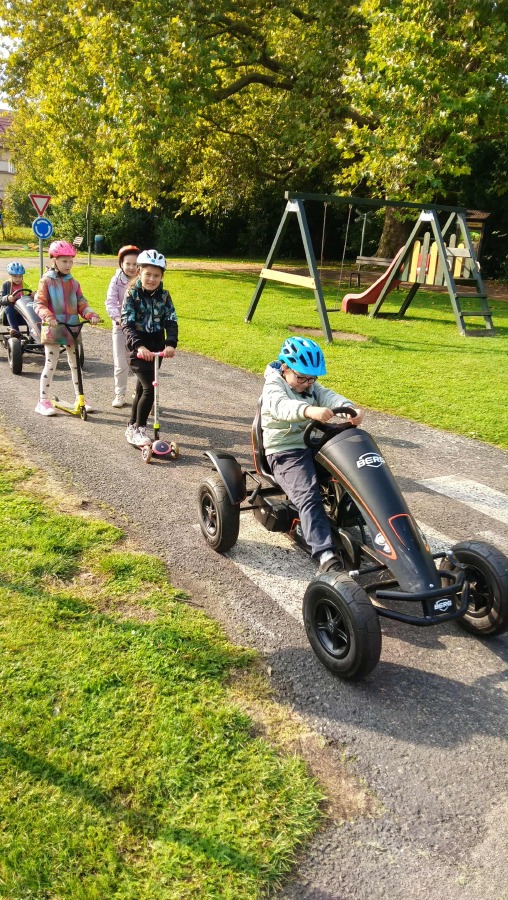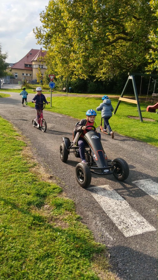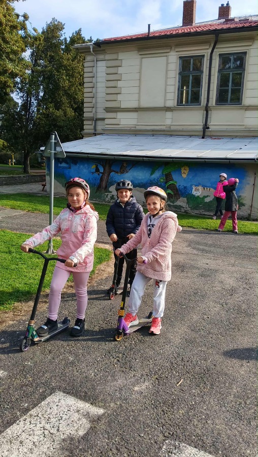 Po evakuaci se žáci vydali na dopravní hřiště DDM Kutná Hora. Dopravní hřiště jsme využili pro výuku dopravní výchovy. Společně jsme si povídali o chování a bezpečnosti v silničním provoze. Děti si vyzkoušely jízdu zručnosti na koloběžkách, kde musely dodržovat dopravní předpisy.