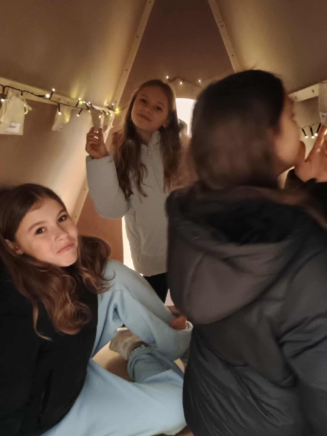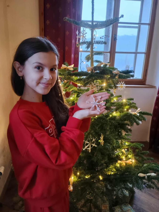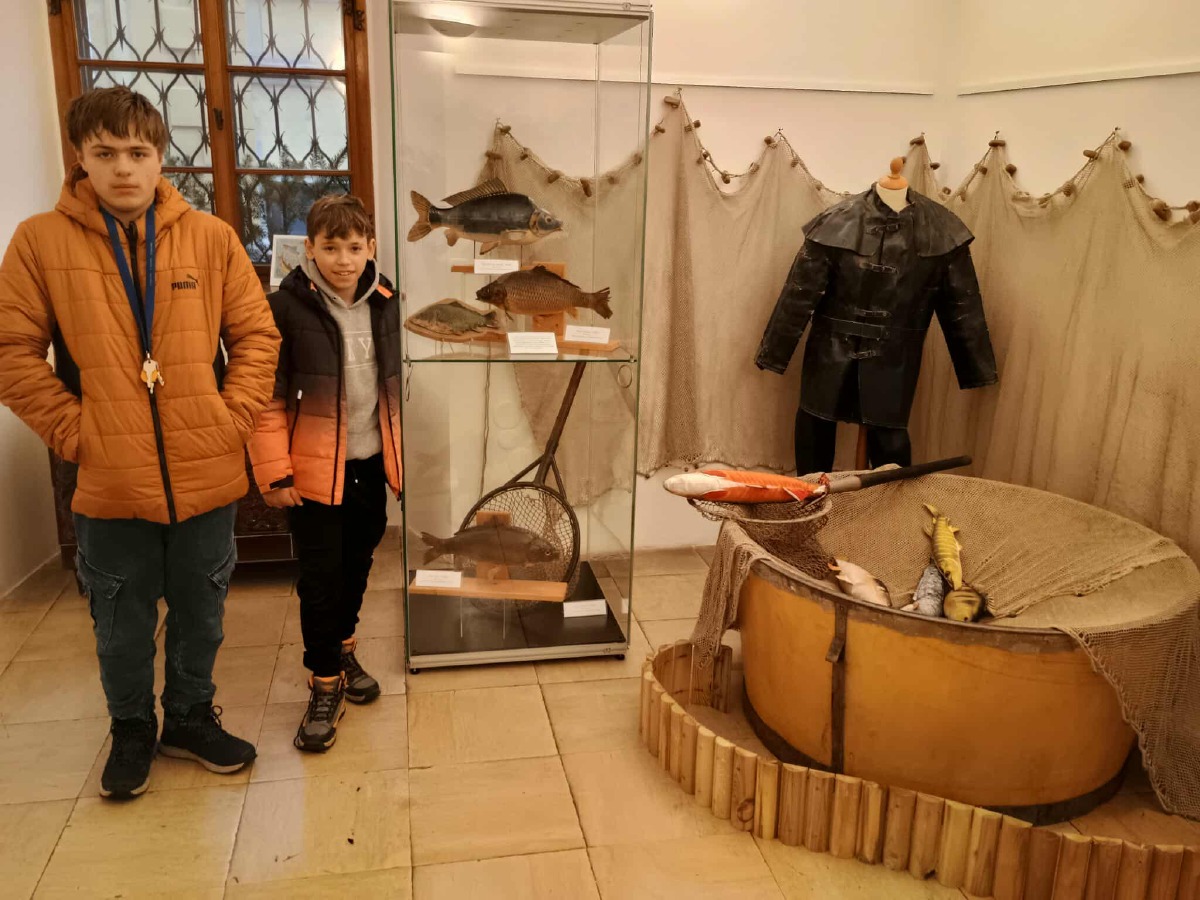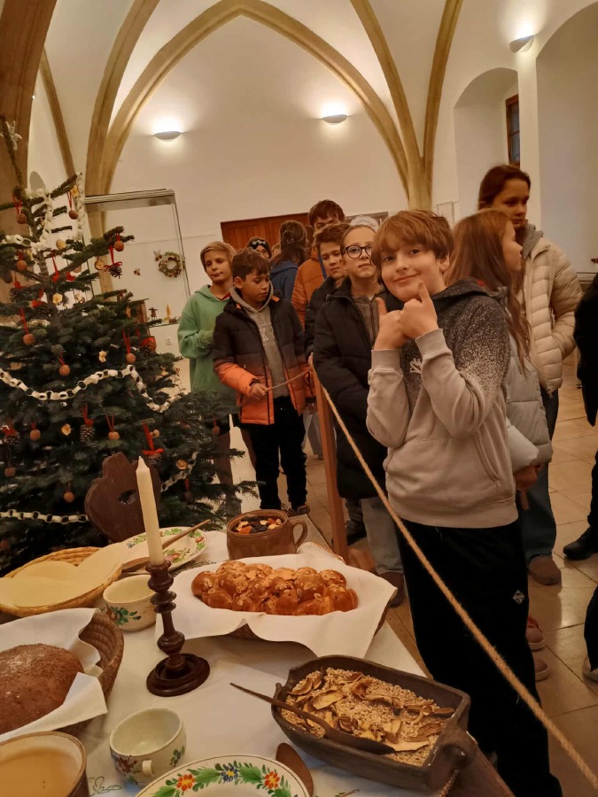 5. prosince jsme navštívili výstavu "Vánoce na talíři". Dozvěděli jsme se, jaké pokrmy se objevovaly v adventu i na štědrovečerním stole našich pra(pra)rodičů - pražma, pučálka, kuba, perníčky..., v chaloupce jsme poznávali perníkové vůně, u rybníku "lovili" papírové ryby, na stolku "porcovali" prasátko, "pletli" vánočku, a také jsme si vyrobili krásné korálkové hvězdy.
