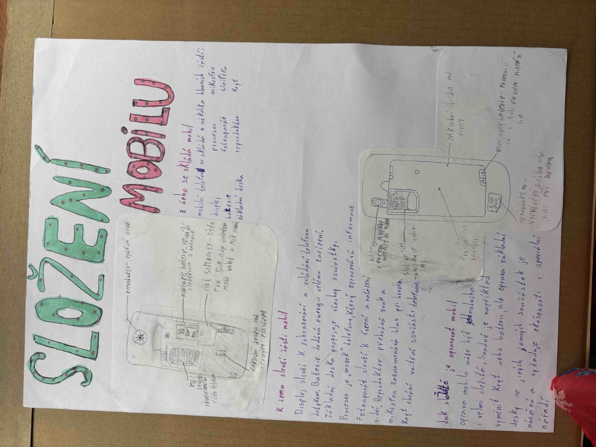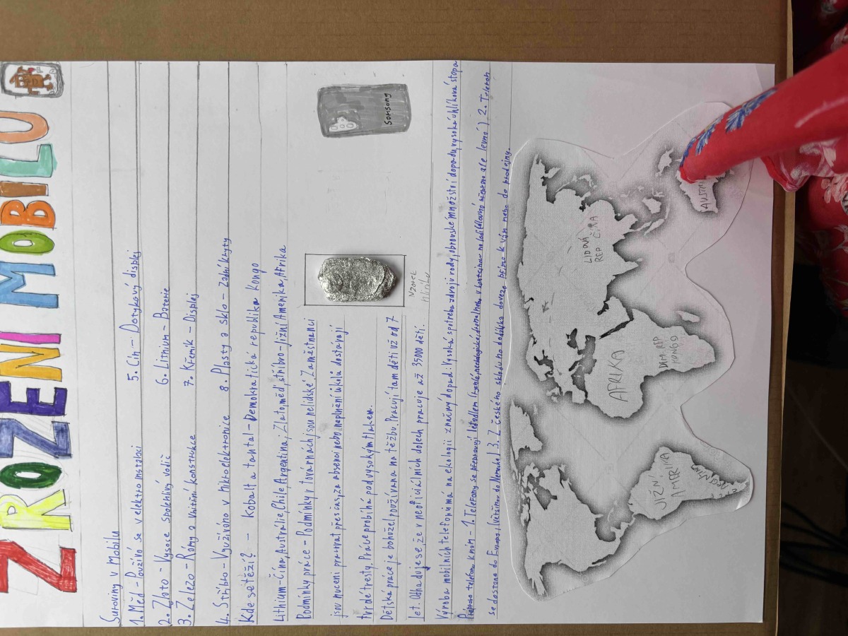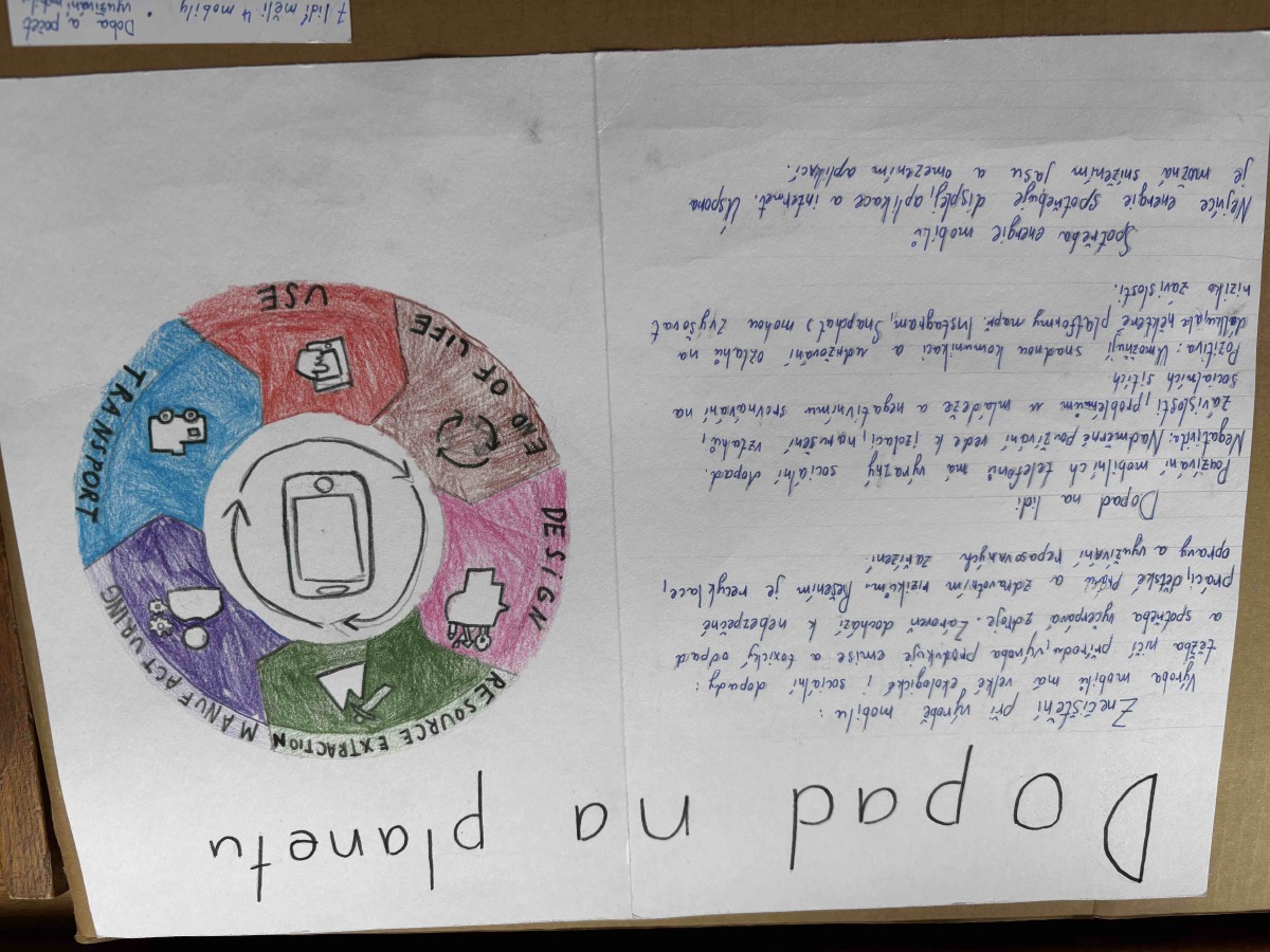 Třída 7.C si u příležitosti Dne Země pracovala na projektu na téma „Mobilní telefon a jeho " život“. Žáci pracovali ve čtyřech skupinách. Skupina „Zrození mobilu“ zkoumala suroviny, místa těžby i pracovní podmínky a vytvořila mapu světa s cestou mobilu od dolu k uživateli. Skupina „Co je uvnitř?“ se věnovala složení telefonu a připravila technický plakát. K dispozici měla starý mobil, který si rozebrala. Skupina „Dopad na planetu“ analyzovala ekologické a sociální dopady a vytvořila infografiku doplněnou třídním průzkumem. Skupina „Konec života mobilu“ se zaměřila na recyklaci a elektroodpad a navrhla motivační plakát. Součástí projektu bylo i mapování okolí školy, kde žáci vyhledávali kontejnery a sběrná místa pro elektrozařízení. Výsledky zpracovali do mapy. Projekt žákům pomohl lépe pochopit dopad technologií na planetu i společnost.