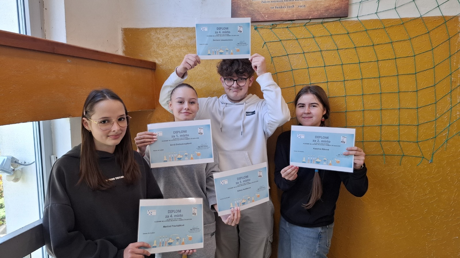 Deváťáci naší školy se zúčastnili okresního kola soutěže Hledáme nejlepšího Mladého chemika ČR, která prověřuje znalosti i praktické dovednosti žáků v oboru chemie.